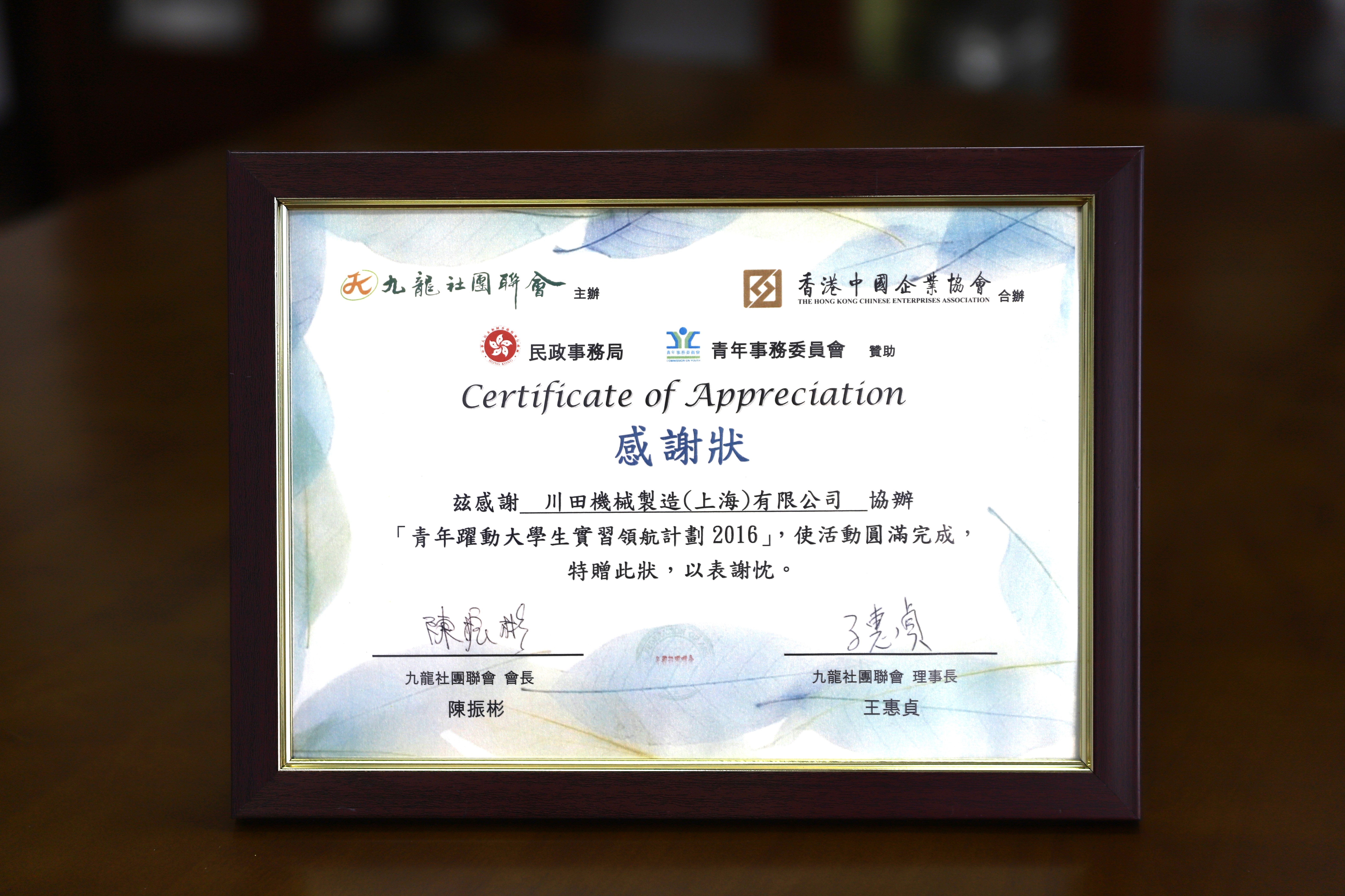 2016 青年悅動(dòng)大學(xué)生實(shí)習(xí)領(lǐng)航計(jì)劃感謝狀